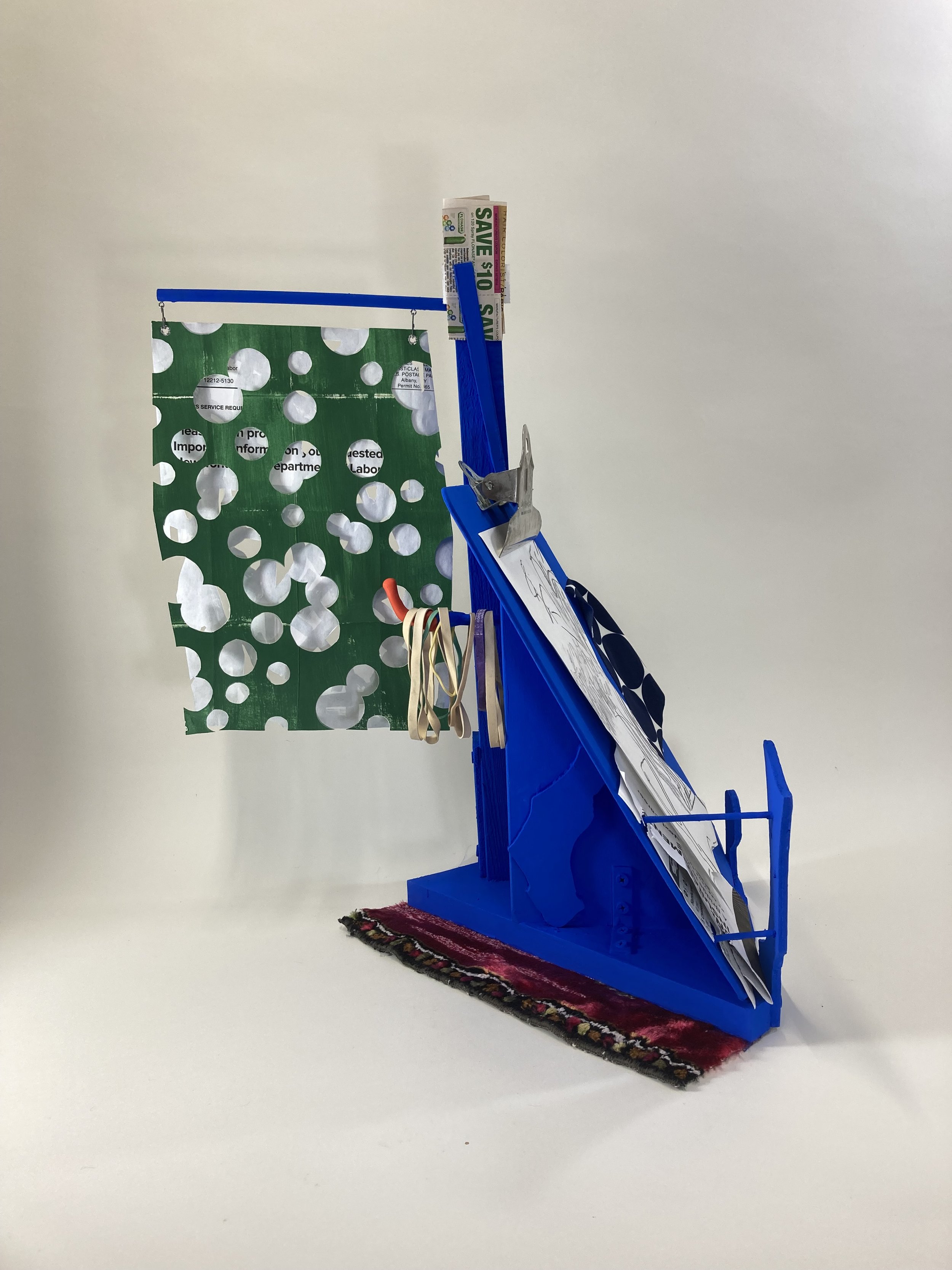 Wood, felt, wire, epoxy clay, air dry clay, grommets, paint, felt, jewelry, mustard packet, paperclip, topical rosacea cream, chocolate coin wrapper / 21 x 11 x 13 inches / 2021 / Private Collection